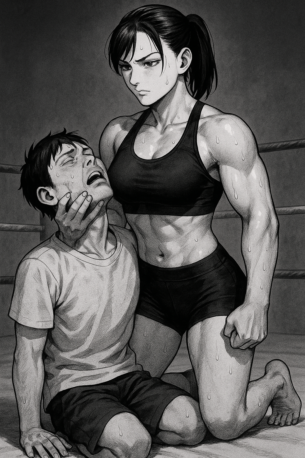 悠太の身体は、痛みと疲労で限界を迎えていた。冷たいリングのマットに膝をつき、汗で濡れた額からは滴がぽたりと落ちる。彼の心は激しく揺れていた。凛の冷たい瞳が彼を見据え、圧倒的な力で彼の意志をねじ伏せようとしている。